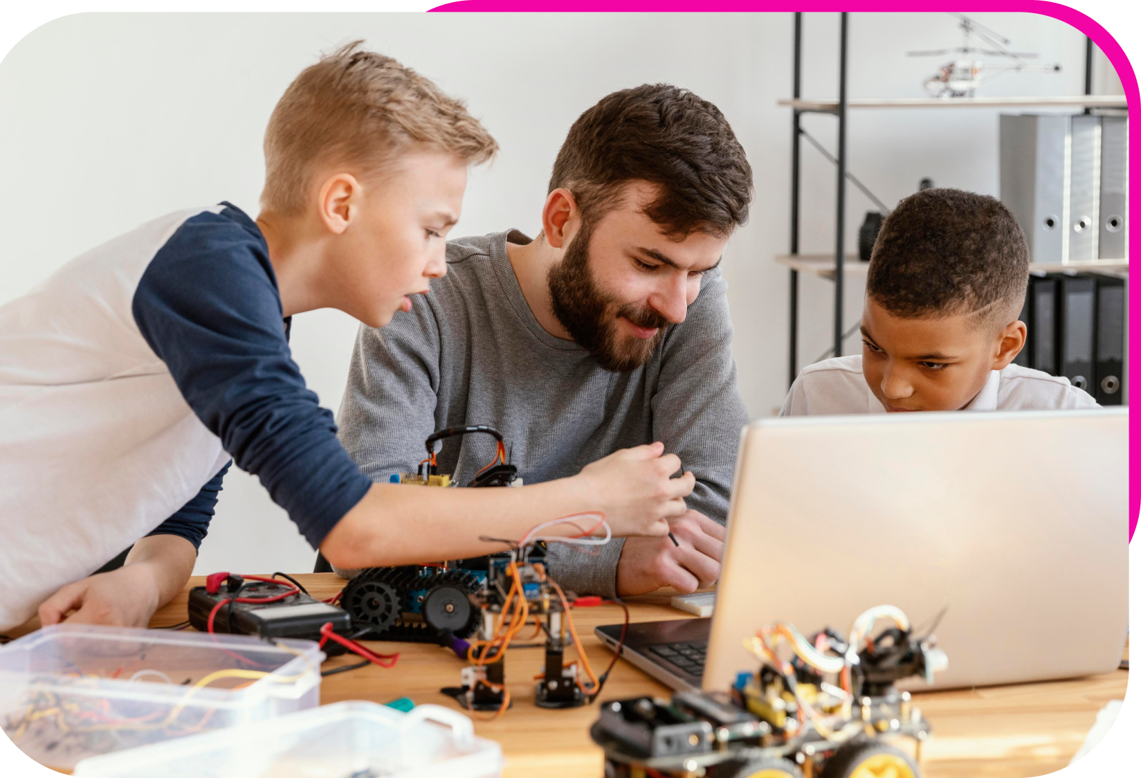 Intermediate concepts in Electronics, Robotics, 3D Printing, and Programming. Developing practical skills and independent thinking.